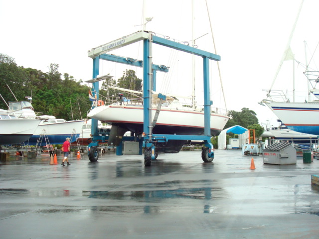 Maandag 21.021.08 om 13.00 ging de boot uit het water. Veel wind en regen. We moesten van de heren van de travellift met de boeg naar voren erin. Hans heeft dus drie keer gezegd dat gaat niet mannen met een boot met twee masten, maar goed ze wisten het beter. Liggen na veel vijven en zessen erin, nee het ging dus niet. De boot er weer uit en achteruit erin. Ondertussen natuurlijk verzopen, mascara zat onder mijn kin. Maar goed hij was er dus nu uit. Werd gelijk mossel vrij gemaakt en op de kant gezet.