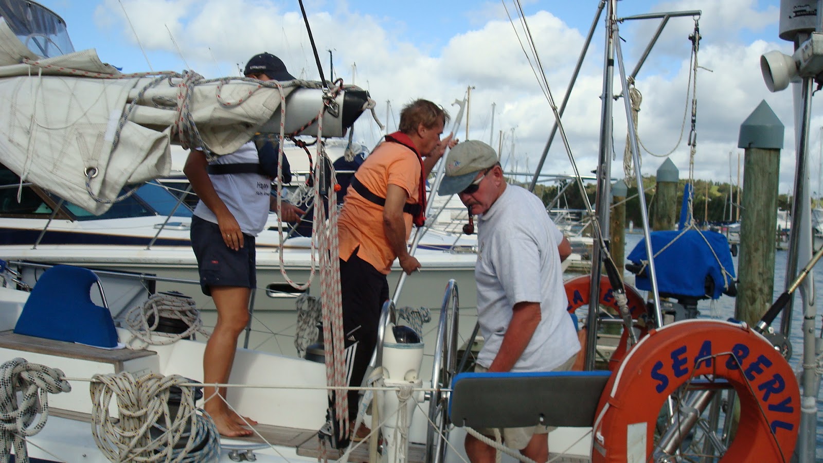 Om 14.00 uur staat de ploeg klaar voor de training. Iedereen heeft de nodige rek en strek oefeningen gedaan en is goed ingesmeerd tegen de felle zon hier. Bertus eerst nog een pijpje opgestoken en Hans een sigaretje. De taktiek voor de wedstrijd van morgen wordt nog even doorgenomen en dan vaart Bertus met zijn bemanning de box uit voor wat verdere instructies en training. Iedereen is erg gemotiveerd en uiterst geconcentreerd. Het bier staat uiteraard al koud. Om 16.30 lag de Seaberyl weer op zijn plekje en iedereen had het reuze naar zijn zin gehad. Uiteraard wat concurrentie tussen de bakboord en stuurboord ploeg.