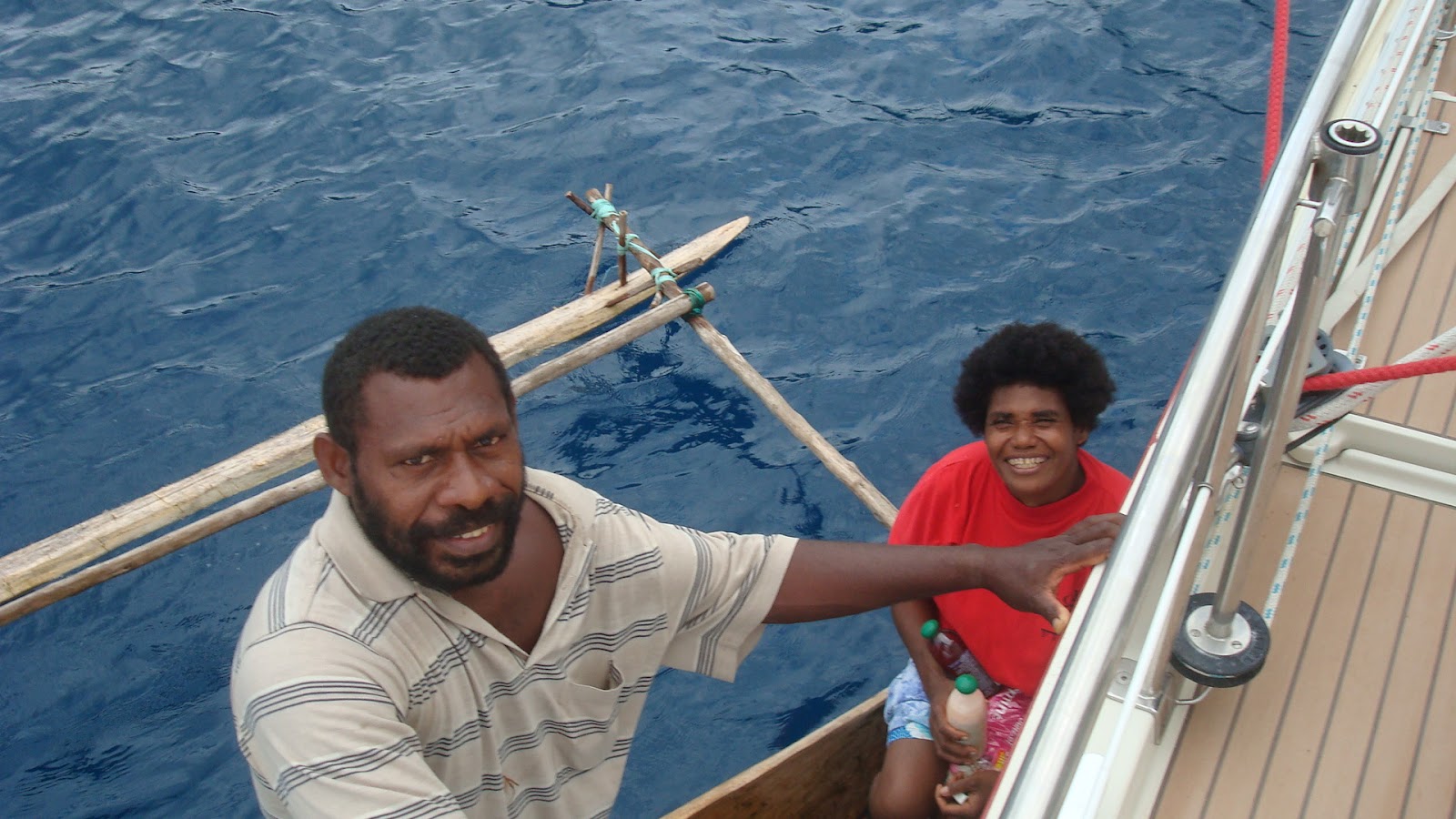 Ze hebben een tekort aan alles hier, dus we hebben wat rijst, lucifers, snoepgoed, bloem, slaolie shampoo ed weggegeven. Zijn ze heel blij mee en in ruil kregen wij allemaal vers fruit zoals ananas, mango, kokosnoten en groene ballen (geen idee wat het is) en citronen. We hebben zoveel gekregen dat ik wel op de markt kan gaan staan.Sommige jongens wilden vannacht voor ons duiken naar kreeft, maar we eten dat niet.