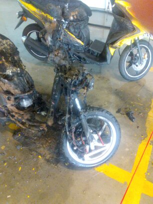 Vorige week werden we vroeg uit bed geklopt, onze brommer was totaal UITGEBRAND in de parkeergarage. Zijn naar het kantoor van de beveiliging gelopen om te kijken of er beelden (CCTV) van waren en ja hoor de daders staan er prachtig op. Ze hebben geprobeerd Hans z'n helm te stelen en toen dat niet lukte hem maar gewoon in de fik gestoken, dat is een behoorlijke brand geworden en ravage nadat de sprinkler af was gegaan. Ook Chris (buurman) z'n brommer is behoorlijk beschadigd. Inmiddels was de politie gearriveerd en moesten mee naar het bureau om een verklaring af te leggen en officieel aangifte te doen. Dat heeft uren geduurd, tot en met de naam van mijn ouders wilden ze weten :)